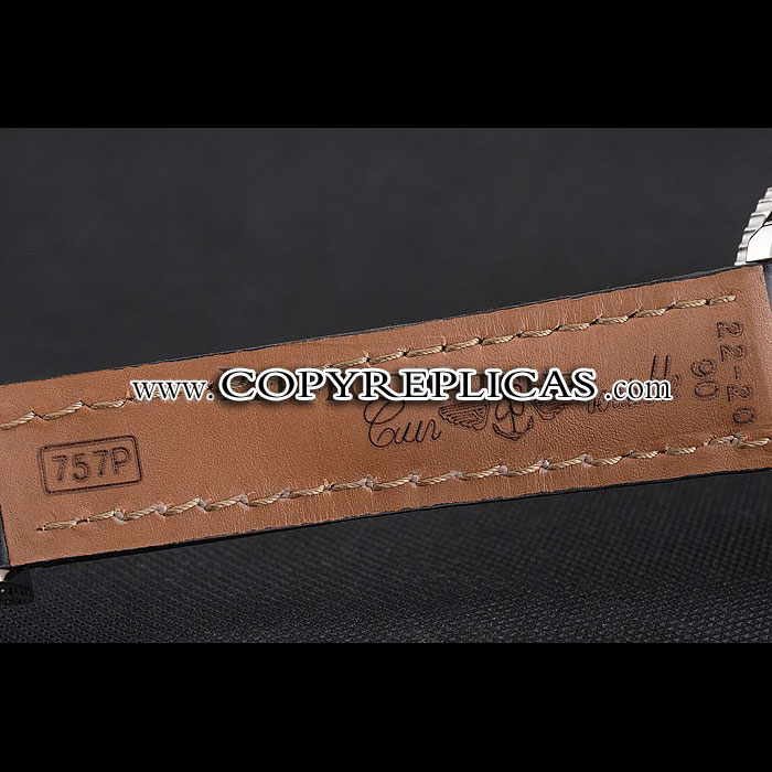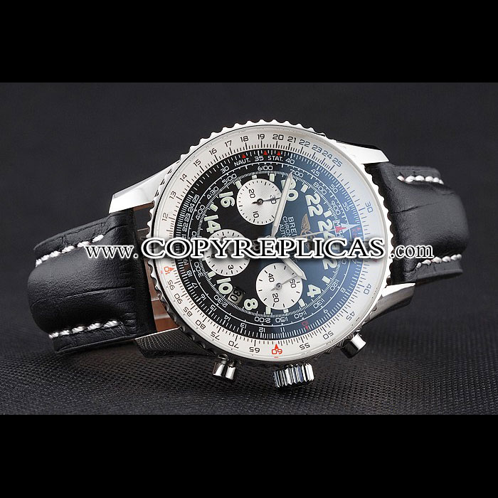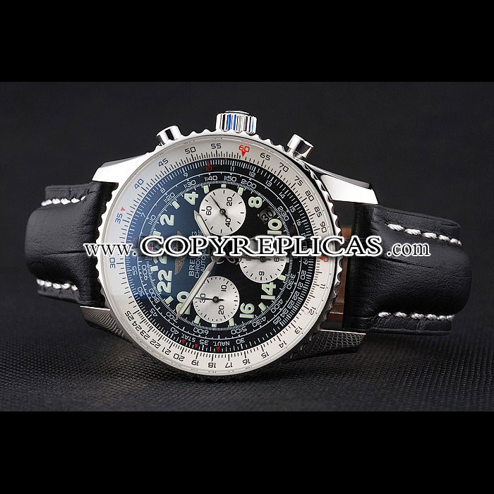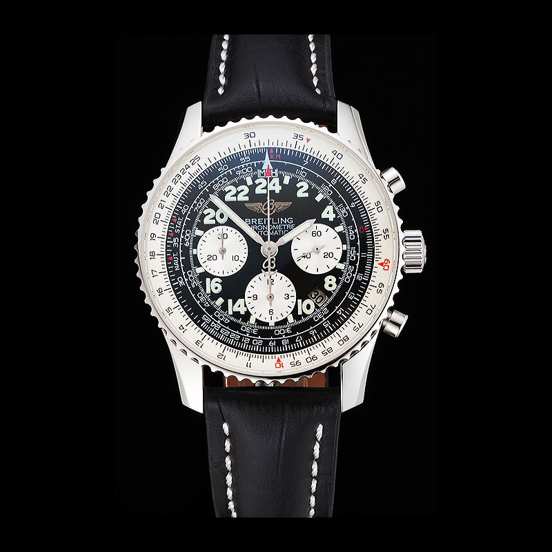 Movement : Kinetic (Automatic) Quality : Swiss ETA Case : Polished stainless steel case Back : Polished stainless steel snap-in back with Breitling engravings Bezel : Polished stainless steel cutwork bezel with tachymeter Crown : Breitling logo carved polished stainless steel cutwork crown with a round push-button crown on either side Bracelet : Cuir Veritable heat embossed black crocodile leather strap with white thread stitching and Breitling logo engraved polished stainless steel fold-in clasp Band Type : Leather Watch Clasp : Flip Clasp Chronograph : Yes Glass : Sapphire Crystal Color : Black Dial Color : Black Gender : Men Diameter : 50 x 43 mm Bracelet Length : 200 x 22 mm Case Thickness : 17 mm Shipping Size : Small