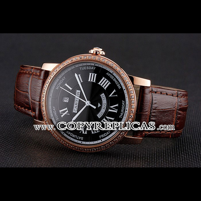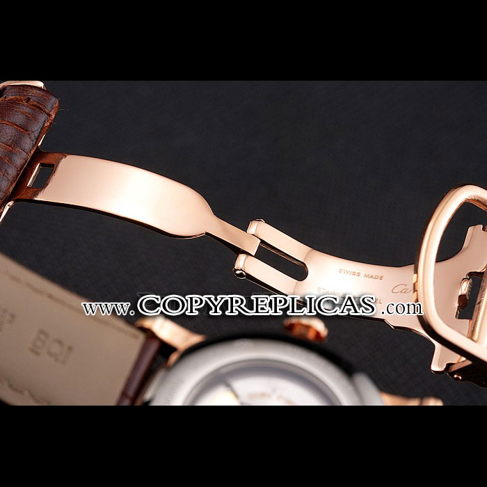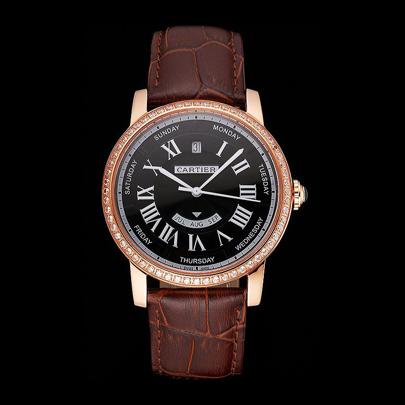 Movement : Kinetic (Automatic) Quality : Swiss ETA Case : 18k rose-gold plated case Back : Polished stainless steel snap-in back with Cartier engravings Bezel : 18k diamond encrusted rose-gold plated bezel Crown : Blue sapphire stud 18k rose-gold plated cutwork crown Bracelet : Cartier and product code heat embossed brown crocodile leather strap with an 18k rose-gold plated fold-in clasp Band Type : Leather Watch Clasp : Flip Clasp Glass : Sapphire Crystal Color : Brown Dial Color : Black Gender : Men Diameter : 50 x 42 mm Bracelet Length : 195 x 22 mm Case Thickness : 11 mm Shipping Size : Small