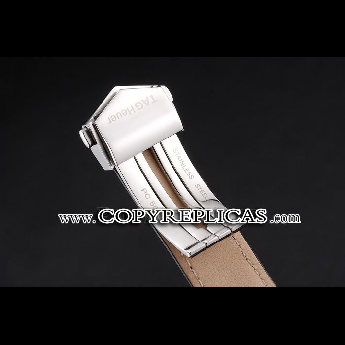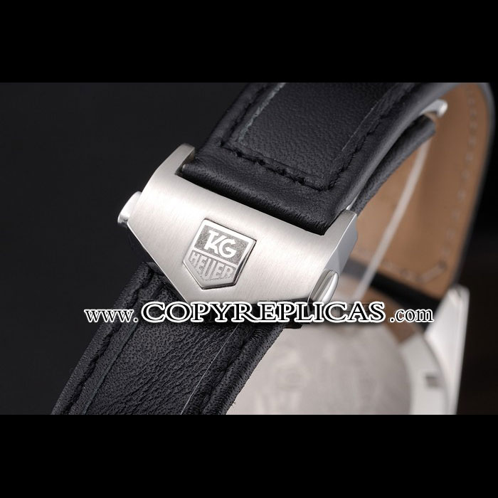 Bracelet : Tag Heuer heat embossed black calfskin leather strap with Tag Heuer engraved brushed stainless steel push-release fold-in clasp