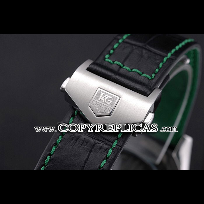 Bracelet : Tag Heuer heat embossed black crocodile leather strap with Tag Heuer engraved brushed stainless steel push-release fold-in clasp