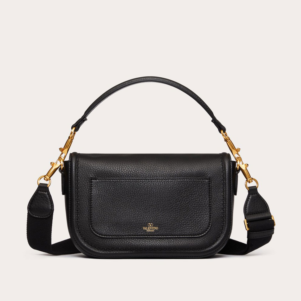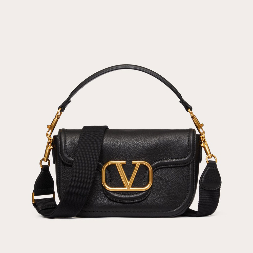 Valentino Garavani Alltime shoulder bag in soft grainy calfskin leather with metallic Vlogo Signature detail. The bag can be worn on the shoulder/cross-body or handheld thanks to the removable handle and removable ribbon shoulder strap.
