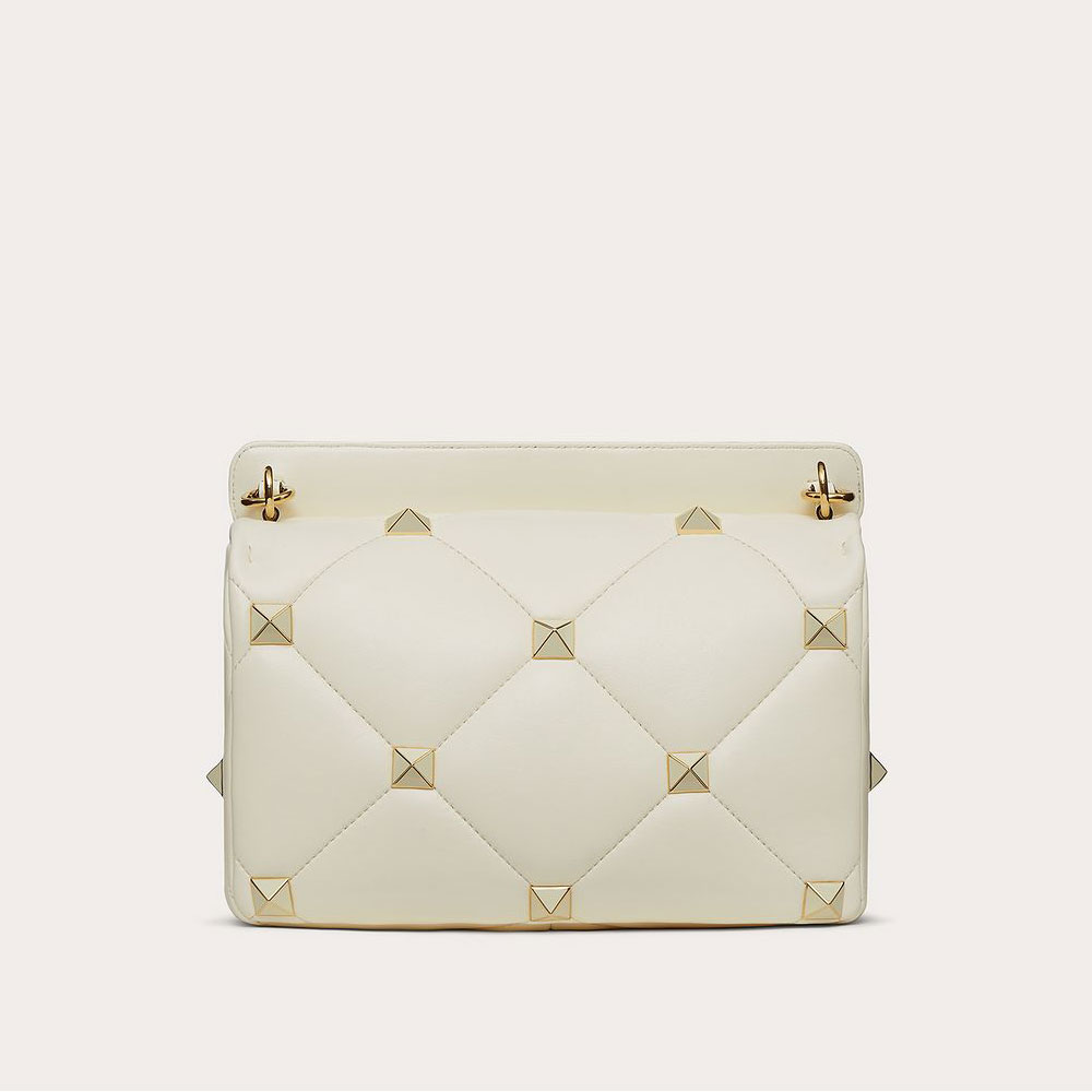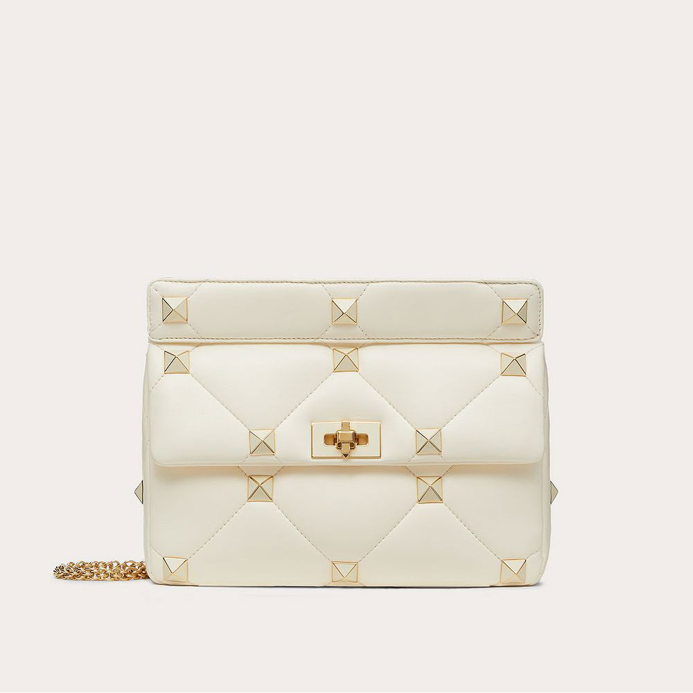Large lambskin nappa Valentino Garavani Roman Stud The Shoulder Bag with chain and enameled tone-on-tone studs.