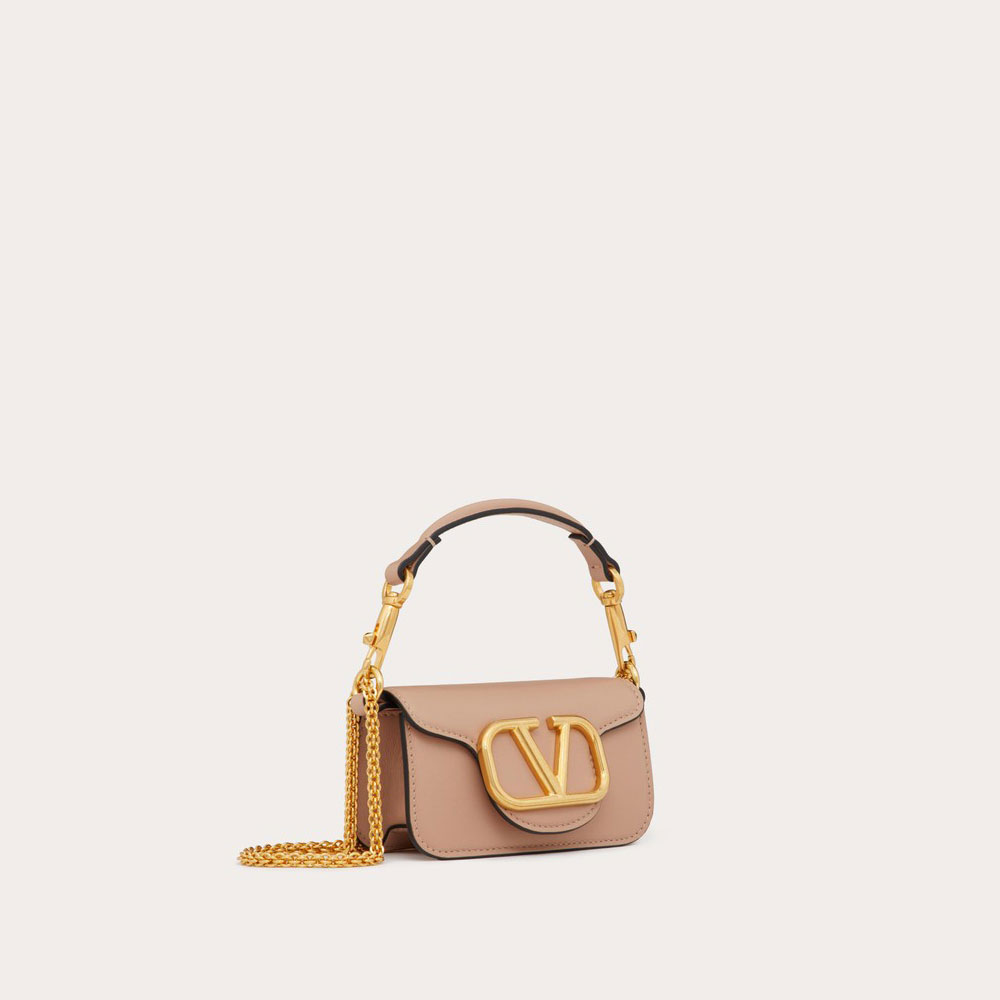 Valentino Garavani Loco micro bag in calfskin leather with chain and Vlogo Signature metallic element. Equipped with both a detachable sliding chain strap and a detachable handle, this accessory can be worn as a crossbody/shoulder bag or carried as a handbag