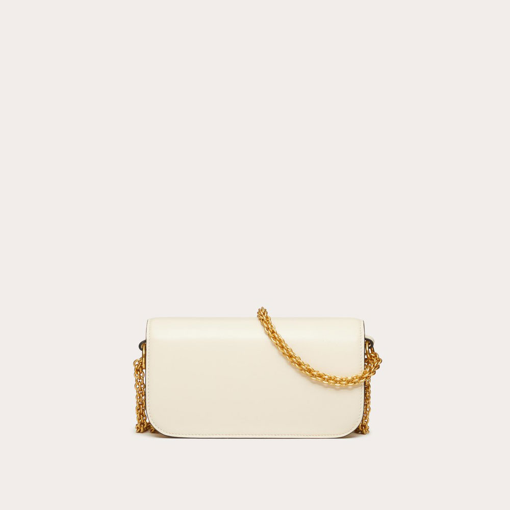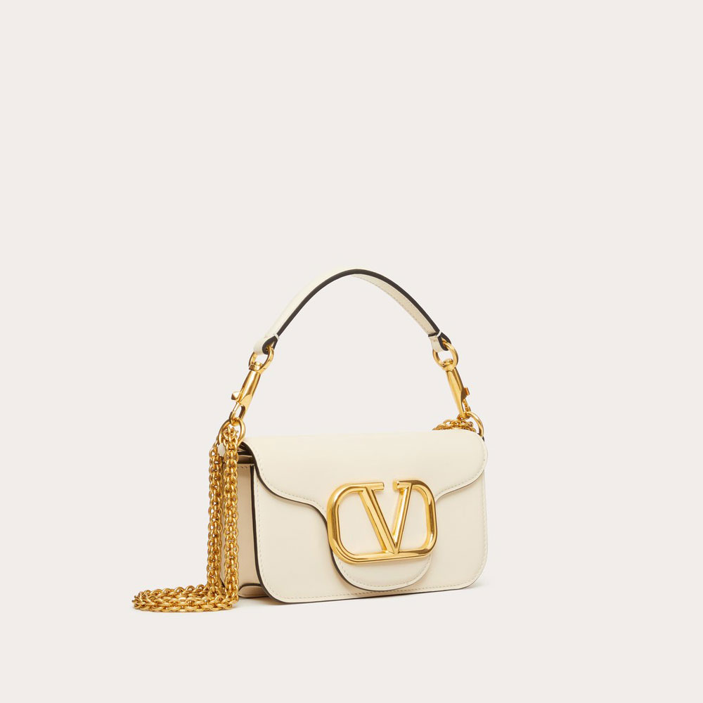 Valentino Garavani Loco women's small shoulder bag in calfskin leather with VLogo Signature metallic element. Equipped with a detachable sliding chain strap and a removable handle, this accessory can be worn as a crossbody/shoulder bag or carried as a handbag.