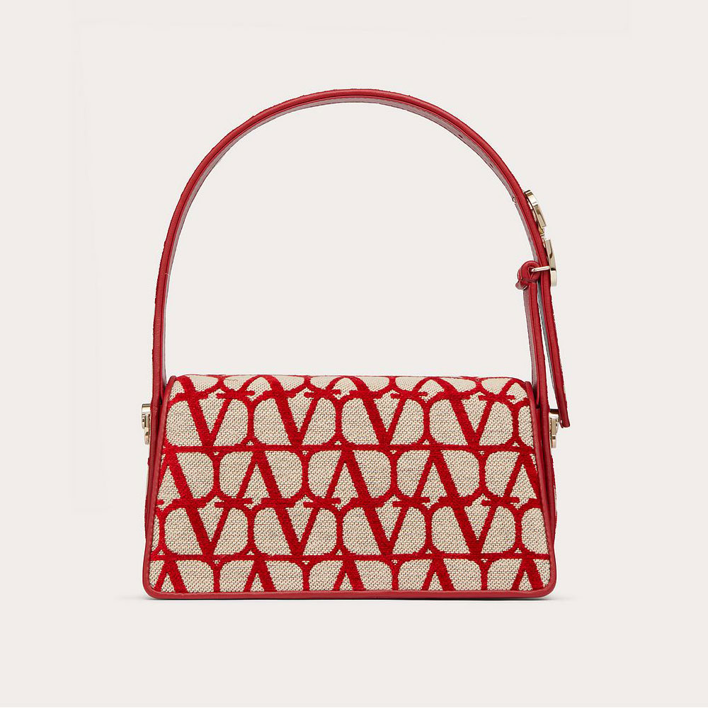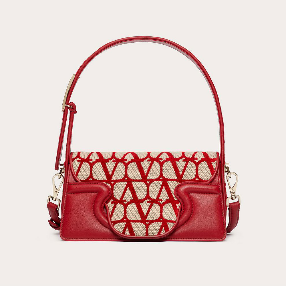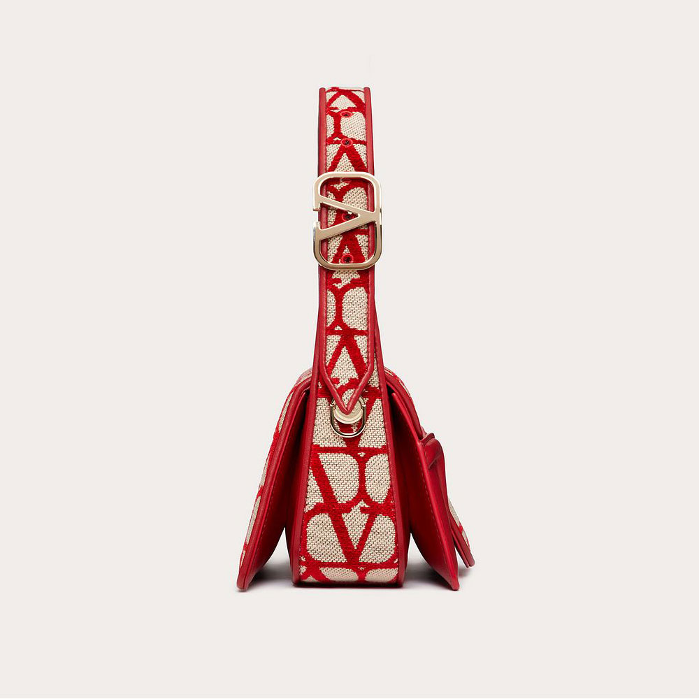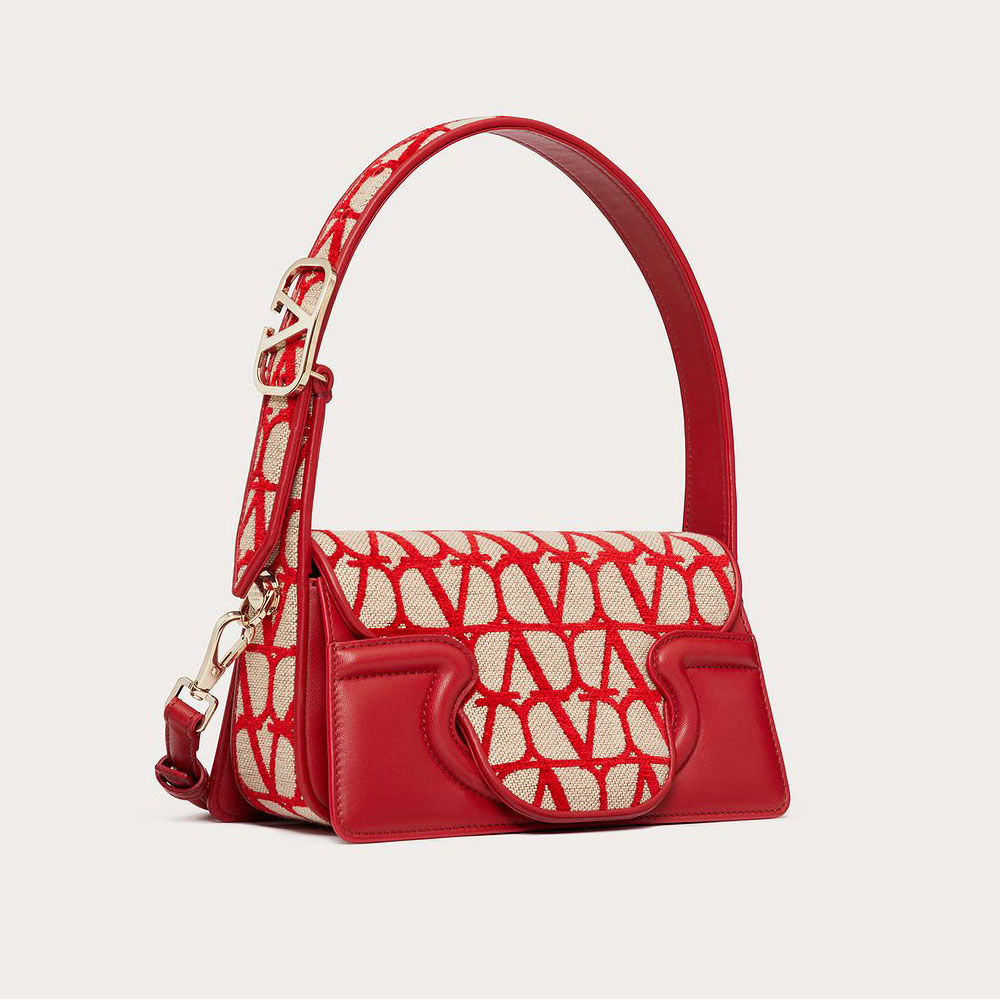 Valentino Garavani Le Petite Deuxieme small shoulder bag in Toile Iconographe and goatskin. The bag features a shaped flap and metallic Vlogo Signature detail on the handle.
