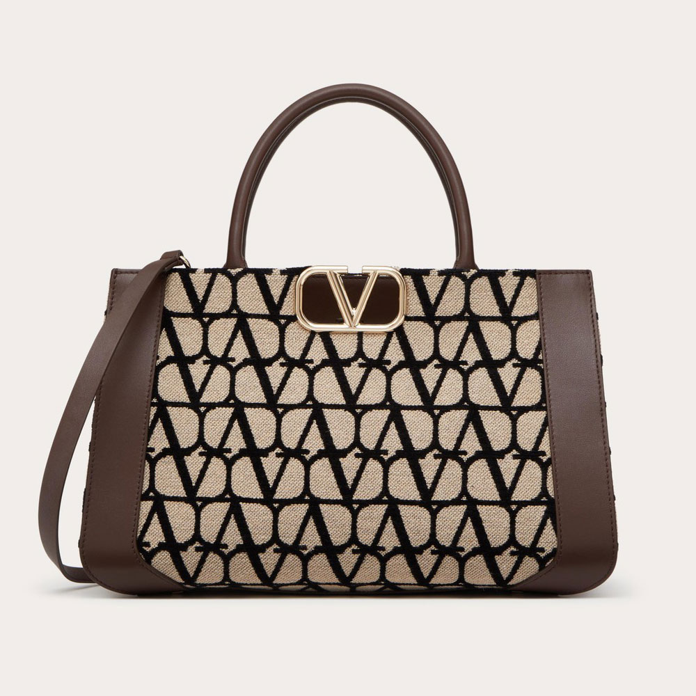 Valentino Garavani Vlogo Signature medium-sized handbag in Toile Iconographe with leather trim and Vlogo Signature element on front.