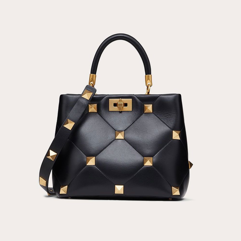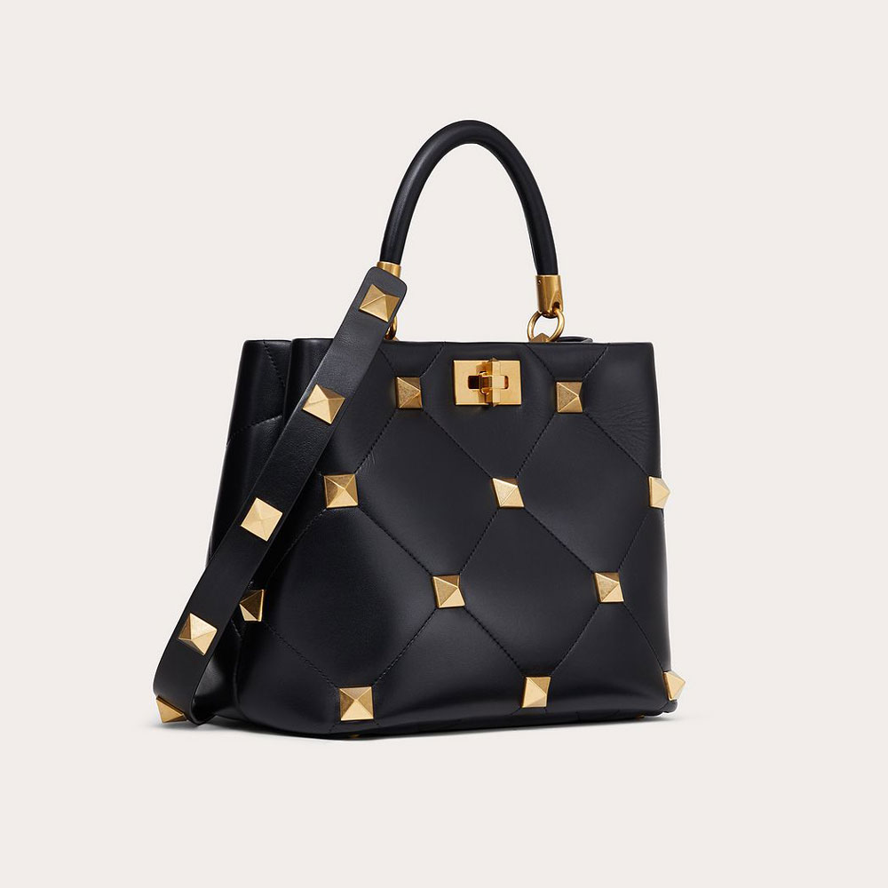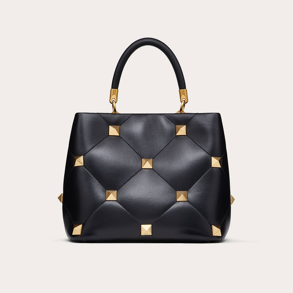 Lambskin nappa Valentino Garavani Roman Stud The Handle Bag. Quilted construction and embellished with maxi studs Equipped with both a detachable sliding chain strap and a detachable leather strap. This accessory can be worn as a crossbody/shoulder bag or carried by hand Quilted nappa. Rhombus pattern enhanced by tone-on-tone stitching Antique-brass-finish metal studs and hardware Front compartment with twist-lock closure Rear compartment with magnetic closure Protective feet Nappa lining. Interior: zippered pocket Dimensions: W28xH20xD16 cm / W11xH8xD6 in