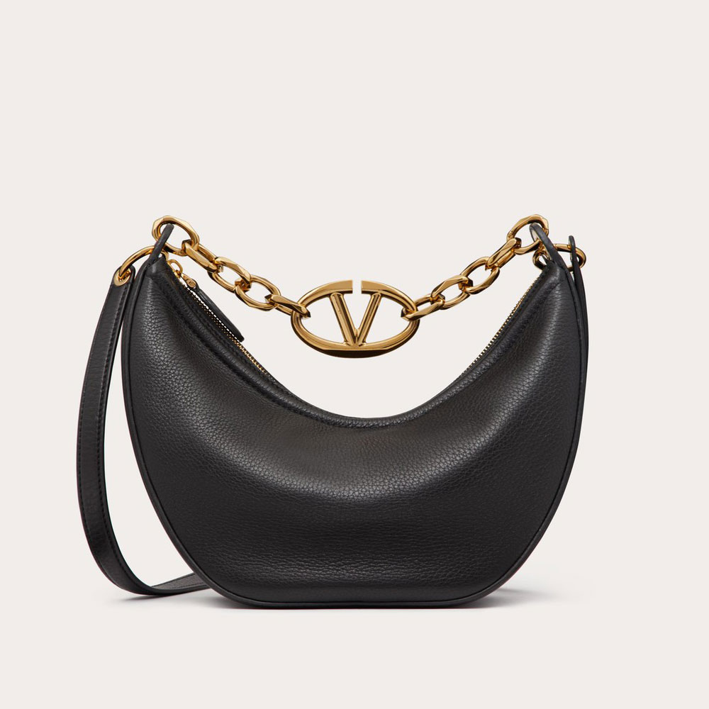 Valentino Garavani Moon small hobo bag in grainy calfskin with chain and metal Vlogo Signature detail. Equipped with a chain and detachable leather shoulder strap, the bag can be worn as a crossbody/shoulder bag or carried by hand. Gold tone-finish chain and hardwar Size:W29 x H23 x D11CM