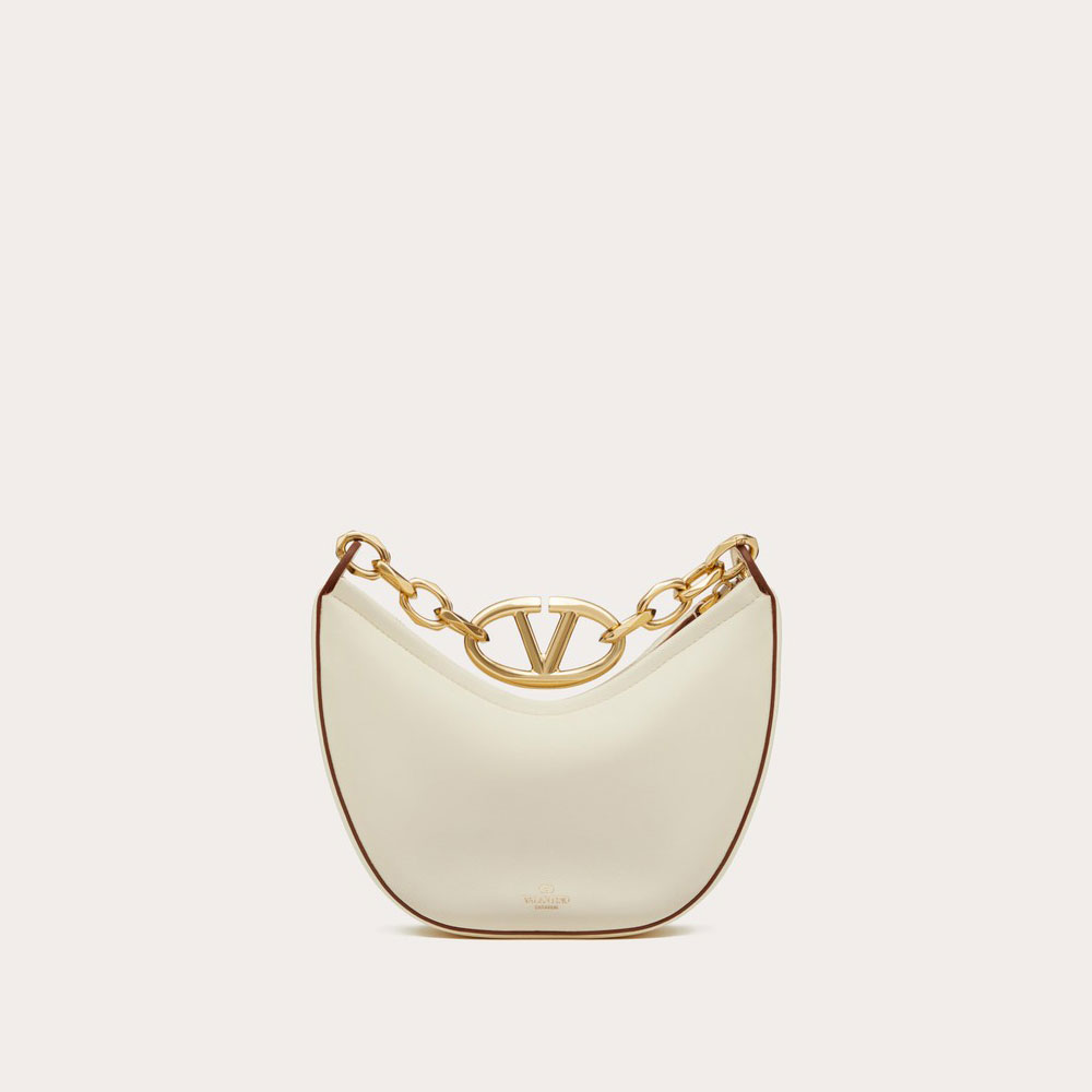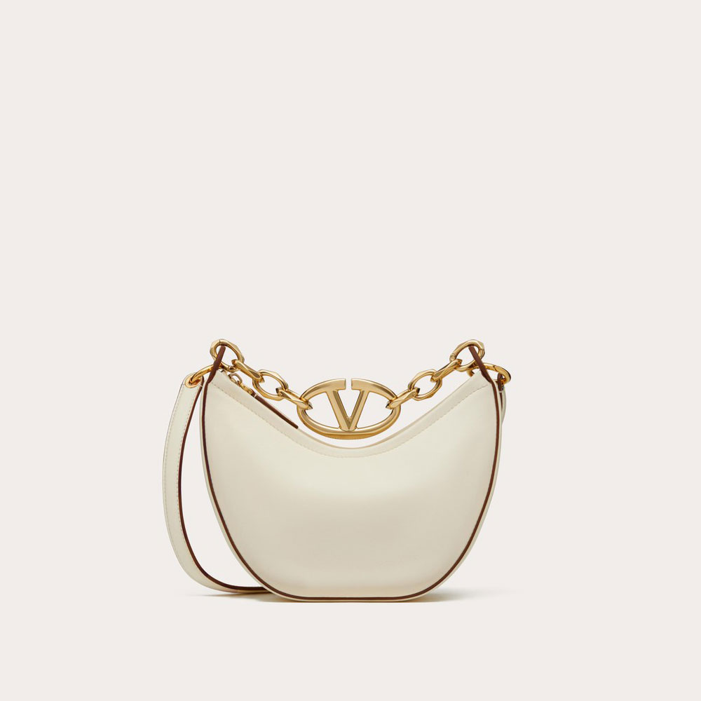 Valentino Garavani Vlogo Moon Mini Hobo Bag in nappa leather featuring chain with metallic Vlogo Signature detail. The bag can be worn as a crossbody bag or handbag thanks to the chain and removable leather shoulder strap.