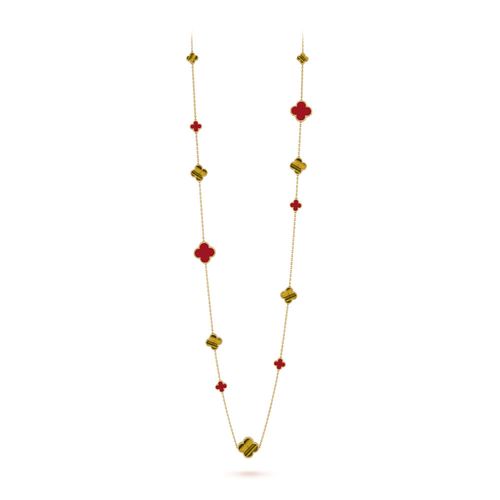 Magic Alhambra long necklace. 16 motifs. 18K yellow gold. carnelian. tigers eye.