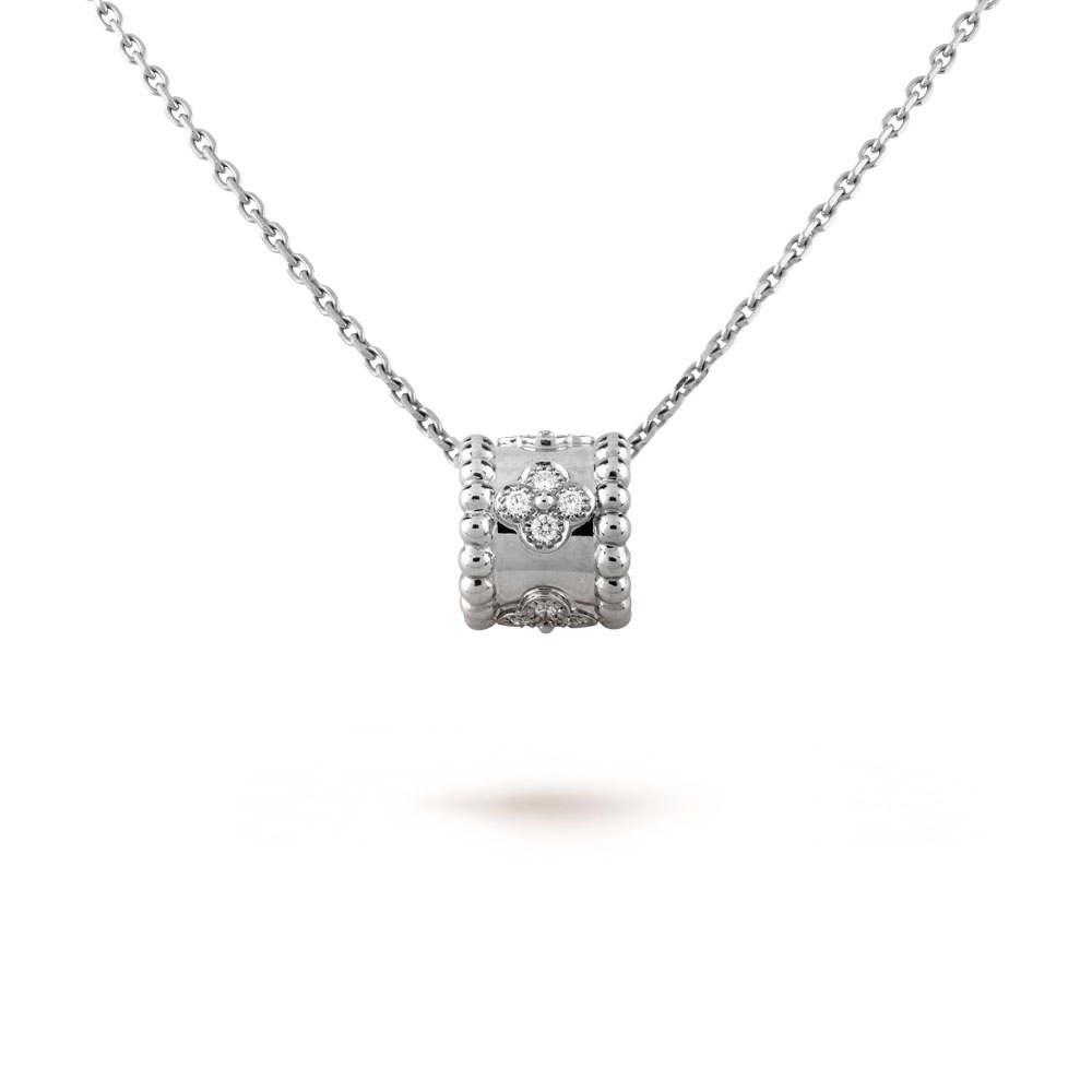Perlee clovers pendant. rhodium plated 18K white gold. round diamonds; diamond quality DEF. IF to VVS.