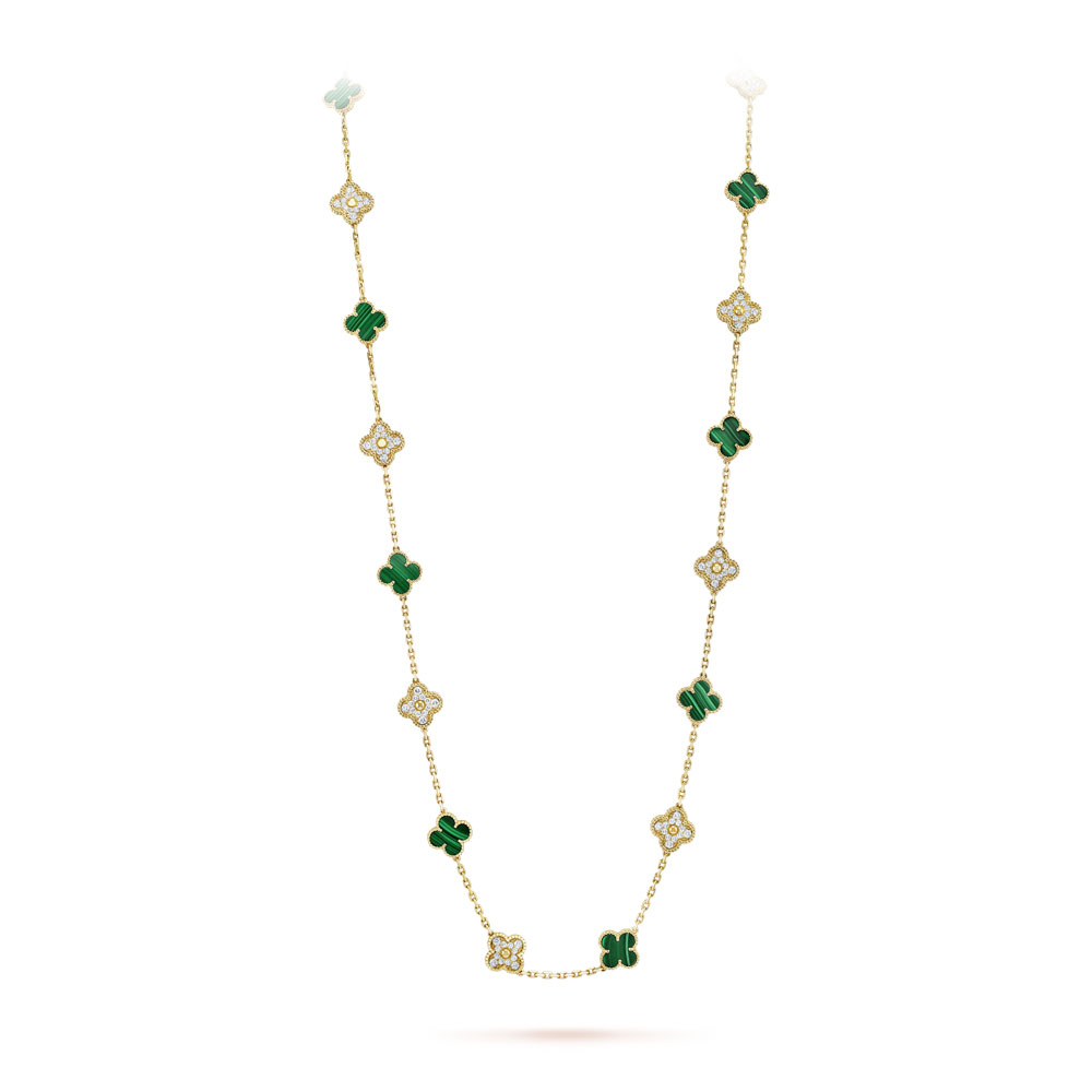Vintage Alhambra long necklace. 20 motifs. 18K yellow gold. malachite. round diamonds; diamond quality DEF. IF to VVS.