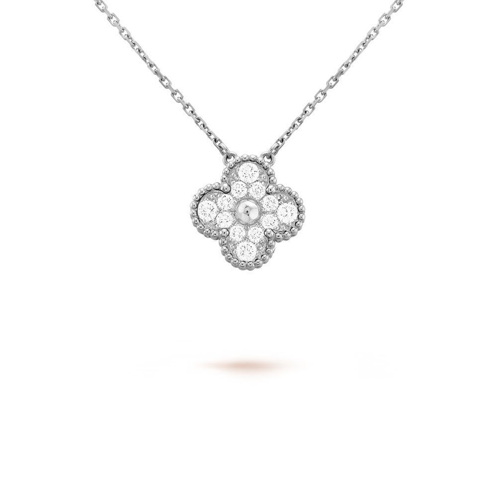 Vintage Alhambra pendant. rhodium plated 18K white gold. round diamonds; diamond quality DEF. IF to VVS.