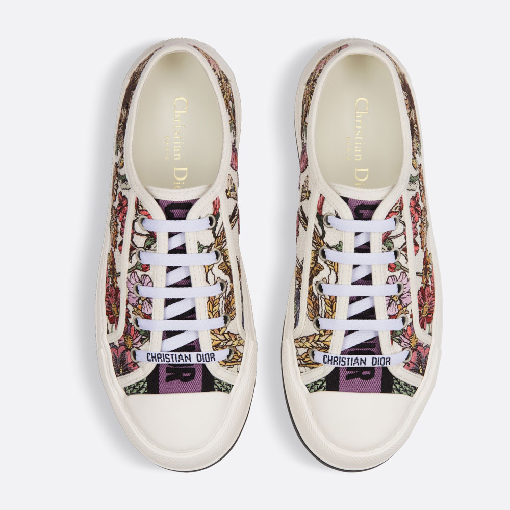 The Walk'n'Dior platform sneaker features the white multicolor Dior 4 Saisons Ete motif by Pietro Ruffo, showcasing summery flowers and plants in a bucolic design. Made in embroidered cotton, the style showcases a thick, comfortable sole, a tongue and Christian Dior Paris laces. The sneaker will lend a modern touch to relaxed looks and can be coordinated with other Dior 4 Saisons creations from the collection.