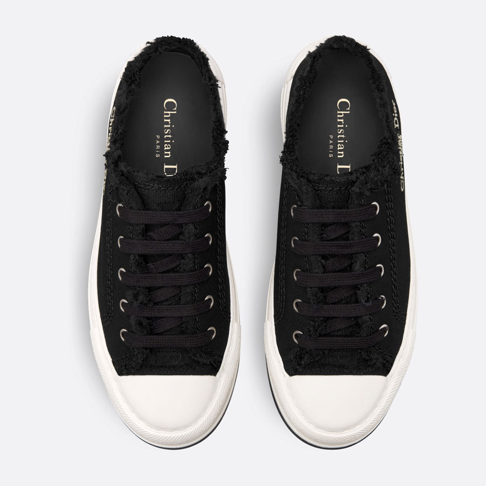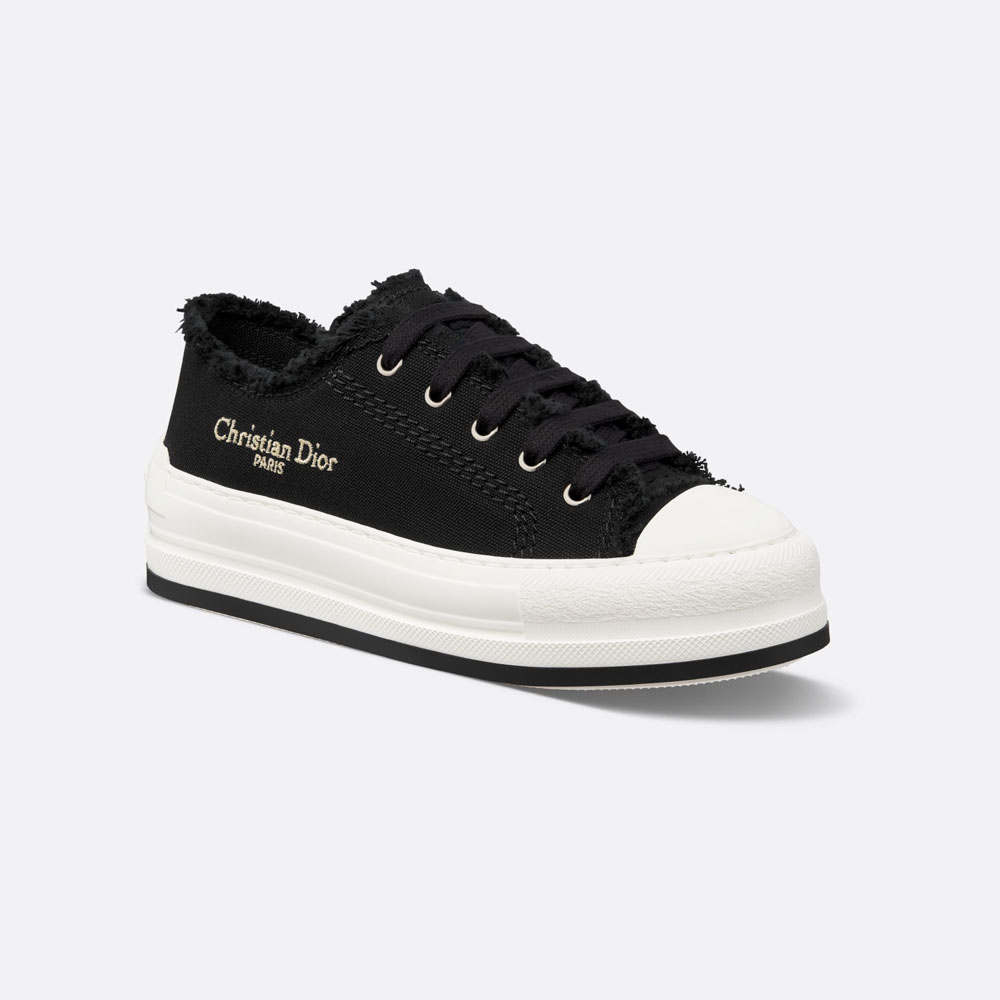 The Walk'n'Dior platform sneaker expands the line with a modern creation. The black cotton canvas upper is distinguished by frayed finishes and the Christian Dior Paris signature embroidered on the side in metallic gold-tone thread. A comfortable and lightweight thick sole and cotton tongue embroidered with the Christian Dior signature complete the design. The sneaker will lend a contemporary touch to relaxed looks.