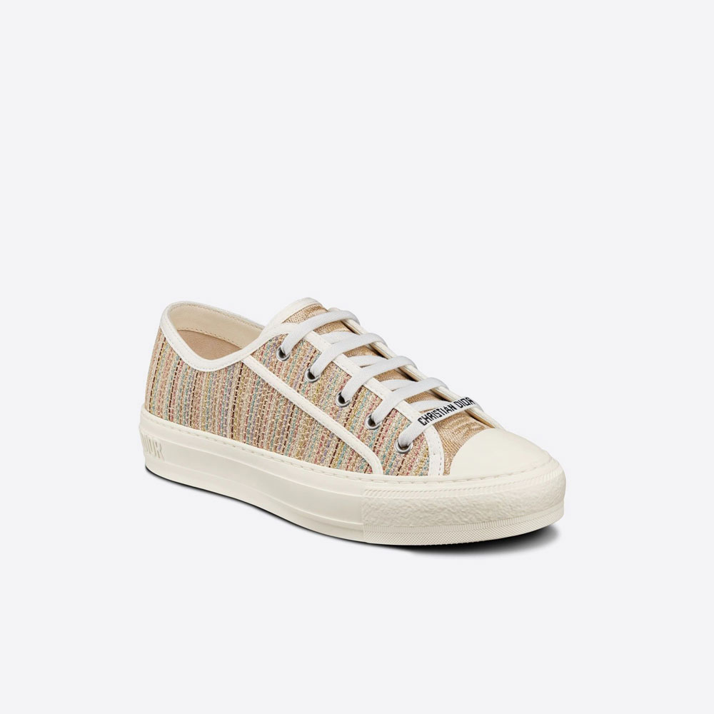 The WalknDior sneaker is part of the Dior Gold capsule collection and features the striped Dior motif. Crafted in multicolor embroidered metallic thread cotton, it has a relaxed style, completed by signatures on the tongue, rubber sole and laces for a timeless look. The sneaker can be paired with other Dior Gold creations.