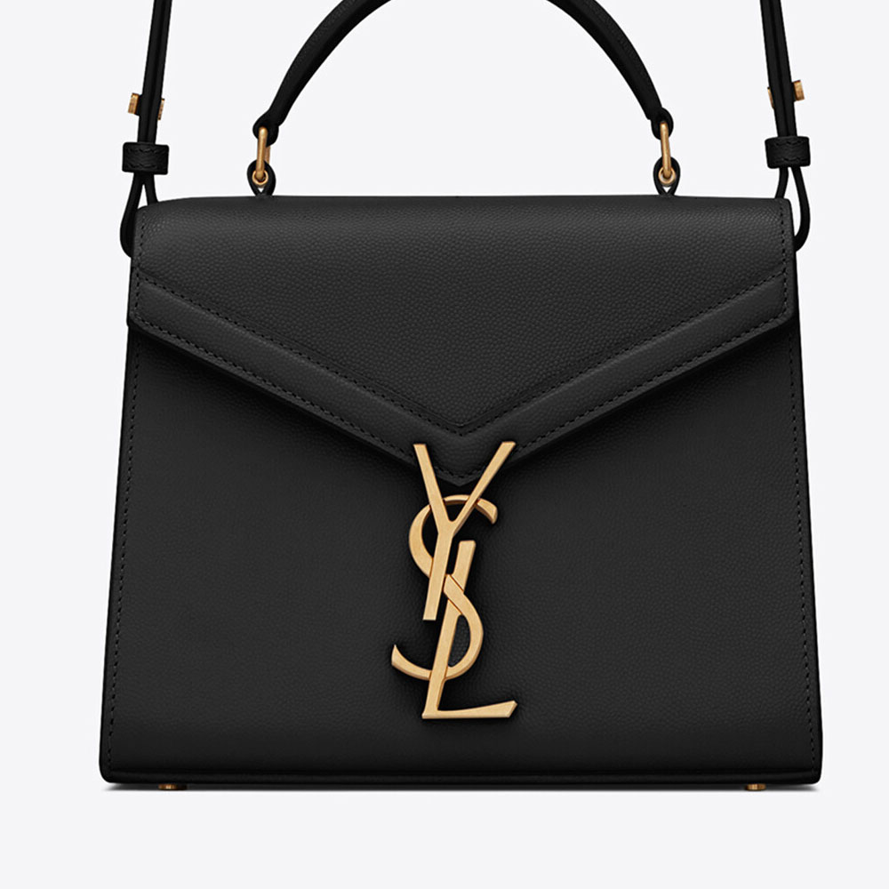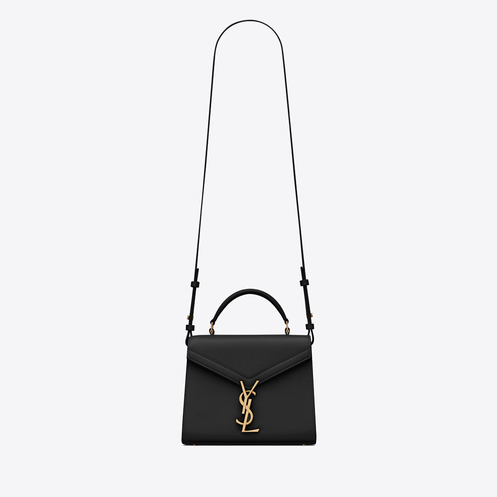 bag with front flap and pivoting ysl metal closure featuring a leather top handle and an adjustable and detachable shoulder strap.
