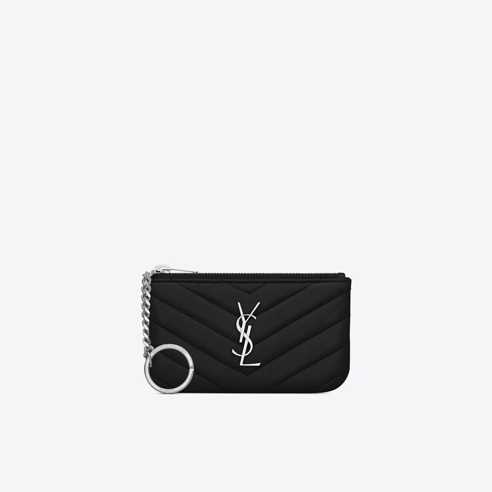 zip top key pouch with saint laurent signature engraved key ring on gourmette chain metal cassandre and matelasse stitching.