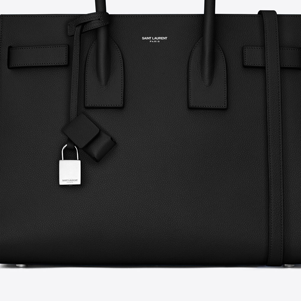 signature saint laurent bag with tubular handles accordion sides compression strap with tabs embossed saint laurent signature and removable shoulder strap.