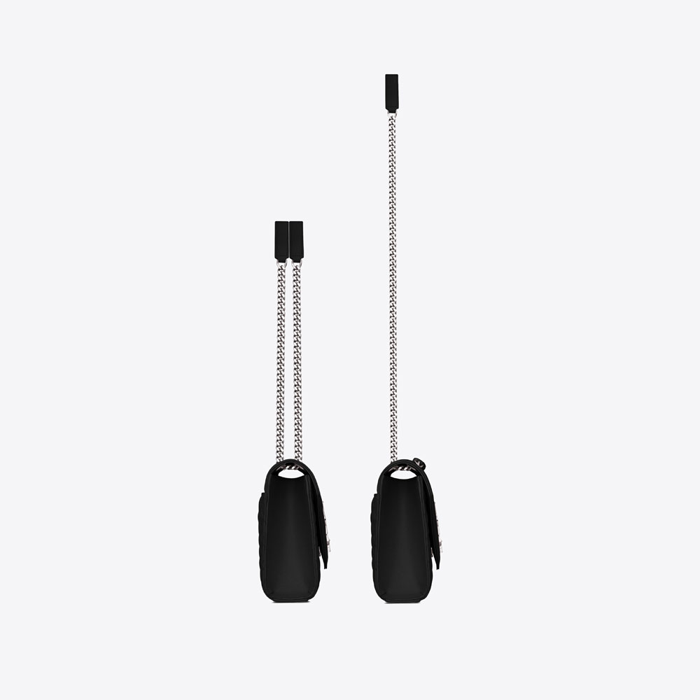 monogram saint laurent bag with front flap adorned with metal interlocking ysl initials leather and chain strap and horizontal and veritcal quilted overstitiching.