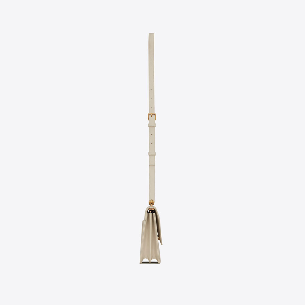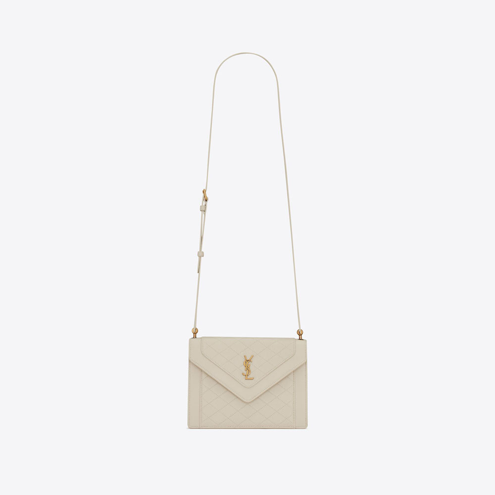 Gaby mini satchel with a front flap magnetic snap closure and interlaced metal YSL initials decorated with carre-quilted overstitching side gussets and featuring an adjustable removable leather strap allowing for shoulder crossbody or hand carry as a clutch.