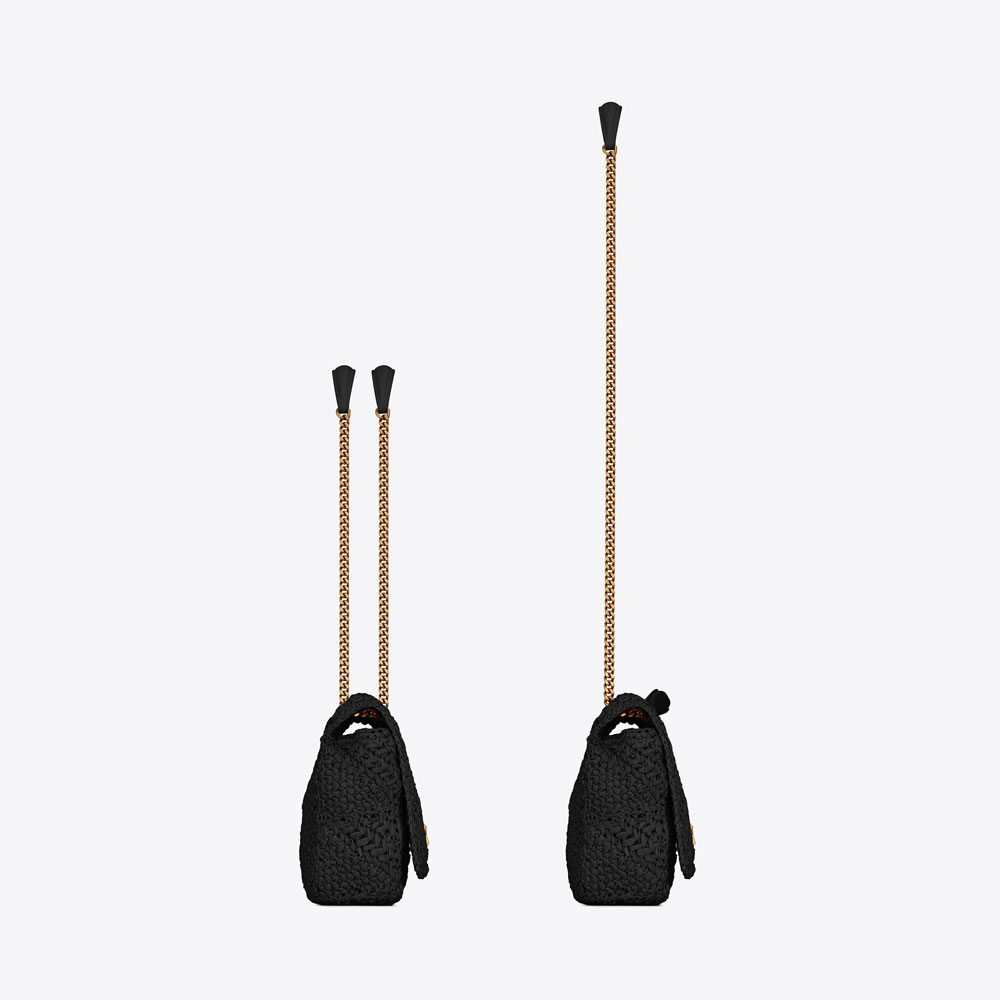bag with a front flap and magnetic snap closure decorated with a carre rive gauche patten featuring a convertible chain strap that can be worn crossbody or doubled for a short shoulder carry.