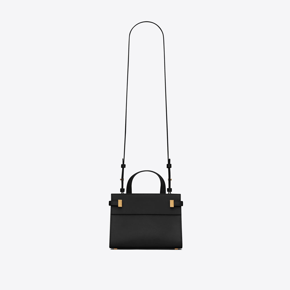 MANHATTAN SHOPPING BAG WITH SAINT LAURENT PARIS-ENGRAVED MAGNETIC CLIP BUCKLE AND COMPRESSION TABS ON THE SIDES FEATURING LEATHER HANDLES AND AN ADJUSTABLE DETACHABLE SHOULDER STRAP.
