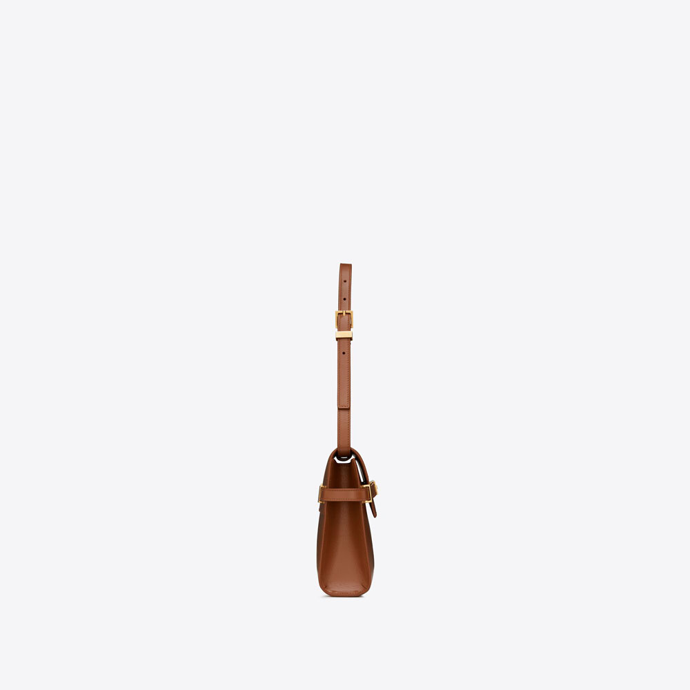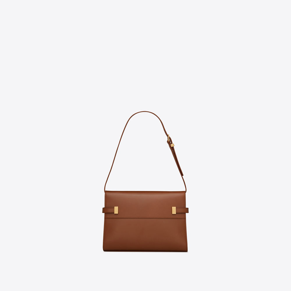 Manhattan small shoulder bag with small top flap featuring compression tabs on the sides.