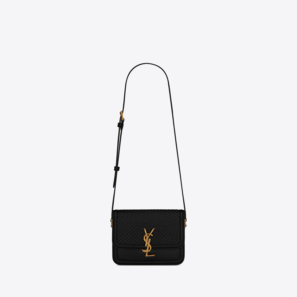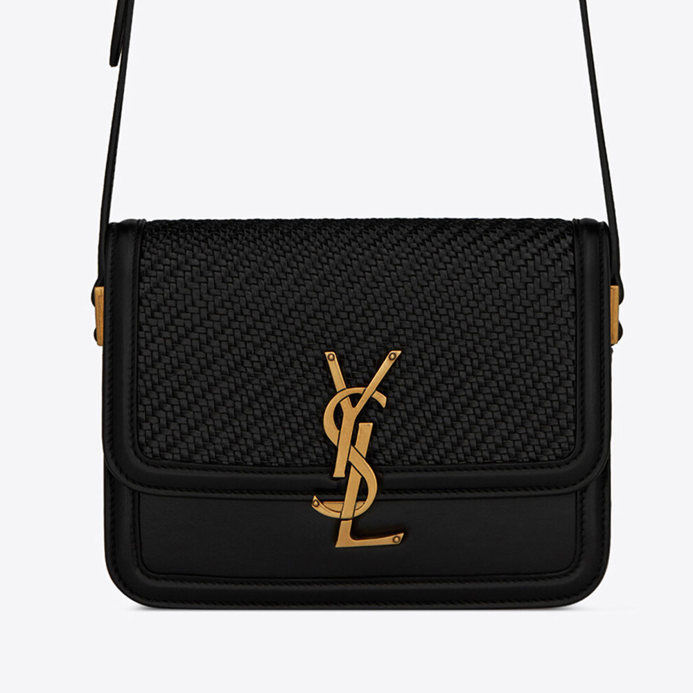 saint laurent monogram satchel bag decorated in hand-woven leather featuring a front flap pivoting metal ysl closure and adjustable shoulder strap.