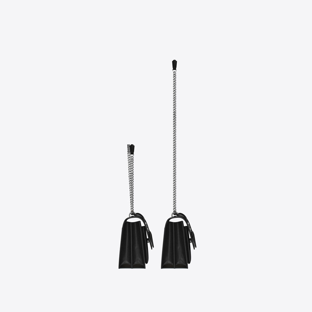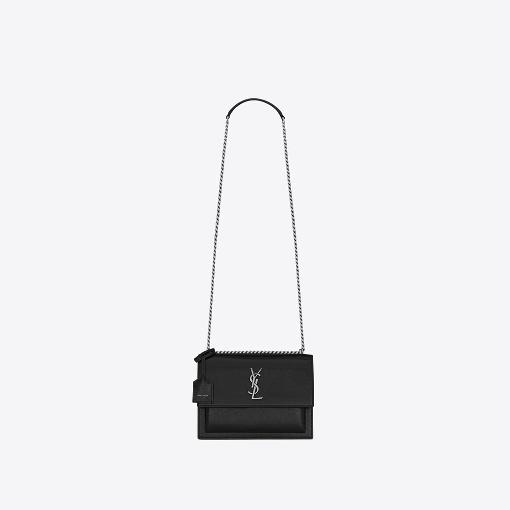 CRAFTED FROM HIGH-QUALITY RESOURCES LEFTOVER FROM PREVIOUS COLLECTIONS THIS SUNSET BAG WITH A FRONT FLAP HAS BEEN DESIGNED WITH UPCYCLING AT ITS CORE. FEATURING A MAGNETIC SNAP CLOSURE AND EMBELLISHED WITH INTERLACED YSL INITIALS IT REFLECTS SAINT LAURENTS COMMITMENT TO SUSTAINABILITY AND INNOVATION. THE LEATHER AND METAL CHAIN STRAP ALSO ALLOWS THIS VERSATILE HANDBAG TO BE WORN A MULTITUDE OF WAYS.